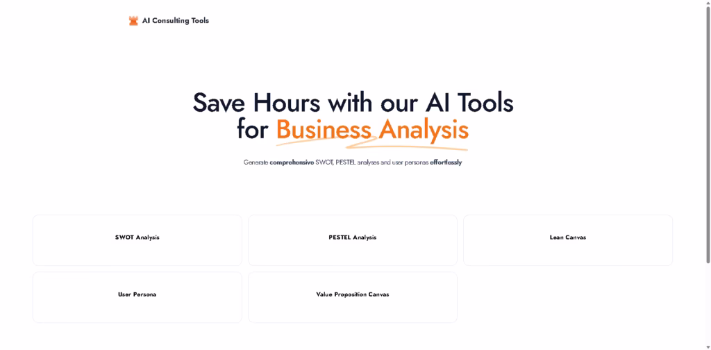 AI Consulting Tools is a suite of AI-powered business analysis tools designed to save time by generating professional SWOT, PESTEL, Lean Canvas, User Persona, and Value Proposition Canvas reports automatically.