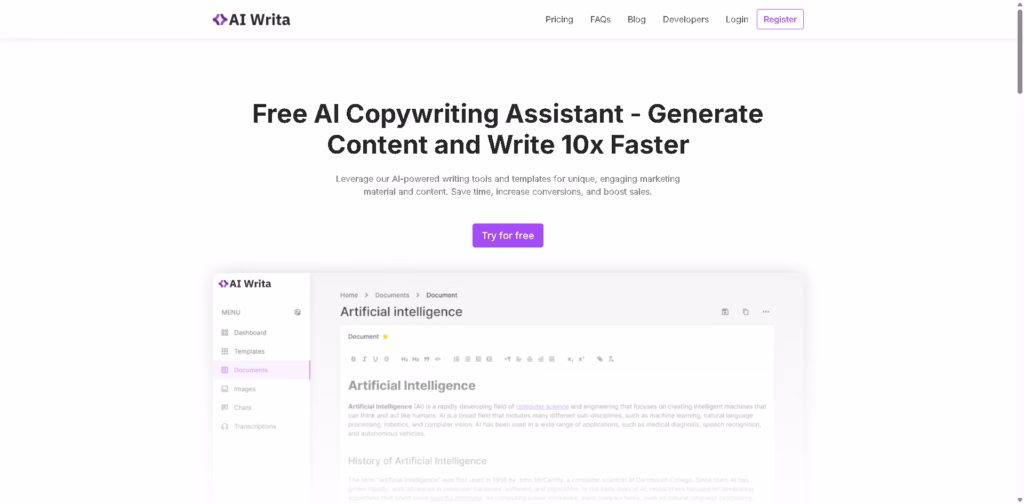 AI Writa offers a well-rounded content creation suite that goes beyond simple text generation. With documents, chat, transcription, and image tools combined in one dashboard, it’s built for users who need both speed and flexibility.