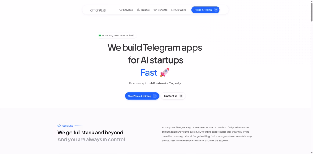 Instead of building traditional mobile apps, Amanu creates Telegram bots and Mini Apps that launch directly to users, delivering a complete MVP in just four weeks.