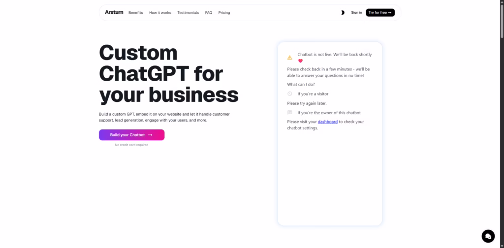 Arsturn lets you create a custom ChatGPT for your business or personal brand. Embed it on your website to handle customer support, lead generation, fan engagement, FAQs, and more-all without coding.