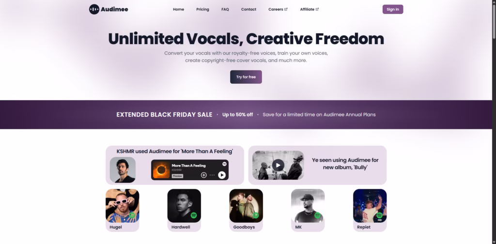 Whether you want to convert your voice, train a custom AI singer, create harmonies, or produce copyright-free cover vocals, Audimee makes it fast, flexible, and professional.