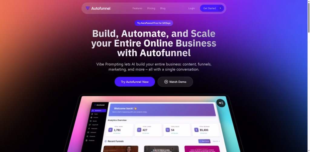 AutoFunnel is an all-in-one AI-powered platform that helps you build, automate, and scale an entire online business from a single conversation.