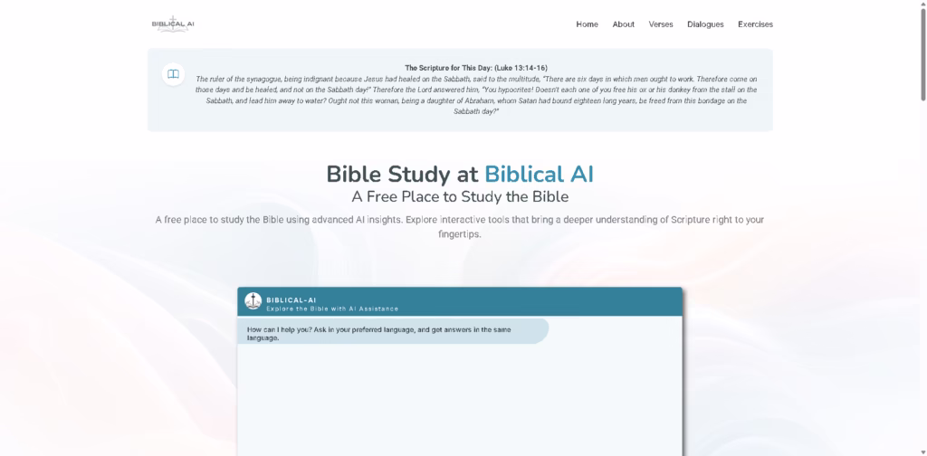 Whether for study, personal reflection, or integration into digital platforms, Biblical AI provides a rich, accessible, and free resource for anyone interested in the Bible.
