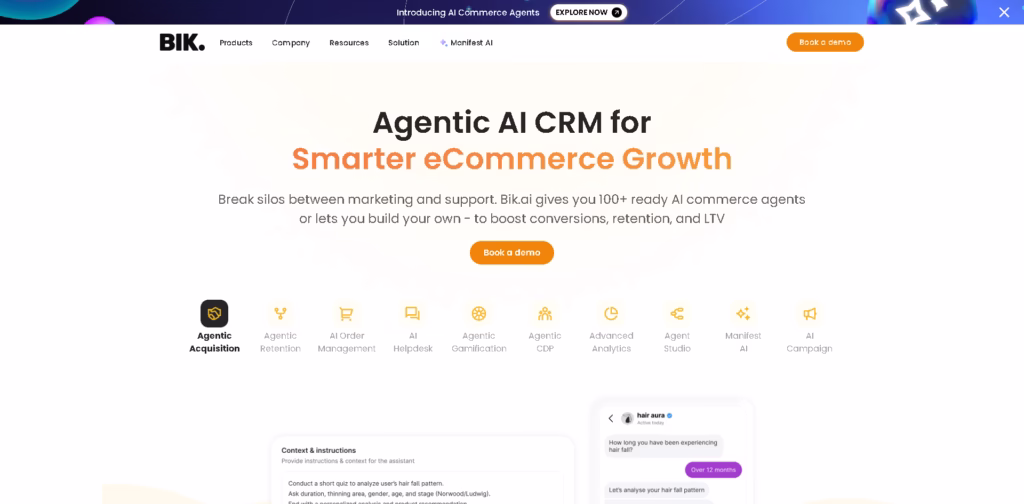 Bik.ai is an AI-powered eCommerce platform that acts like a full digital team for your store. It uses “AI commerce agents” to automate marketing, sales, support, and retention, helping brands boost conversions, repeat purchases, and lifetime value-all without adding more human overhead.