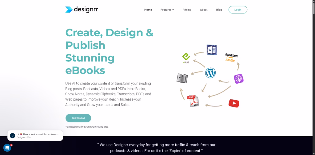Designrr helps you turn existing content-like blog posts, videos, podcasts, or documents-into polished eBooks, Kindle books, lead magnets, flipbooks, and blog posts in just minutes.