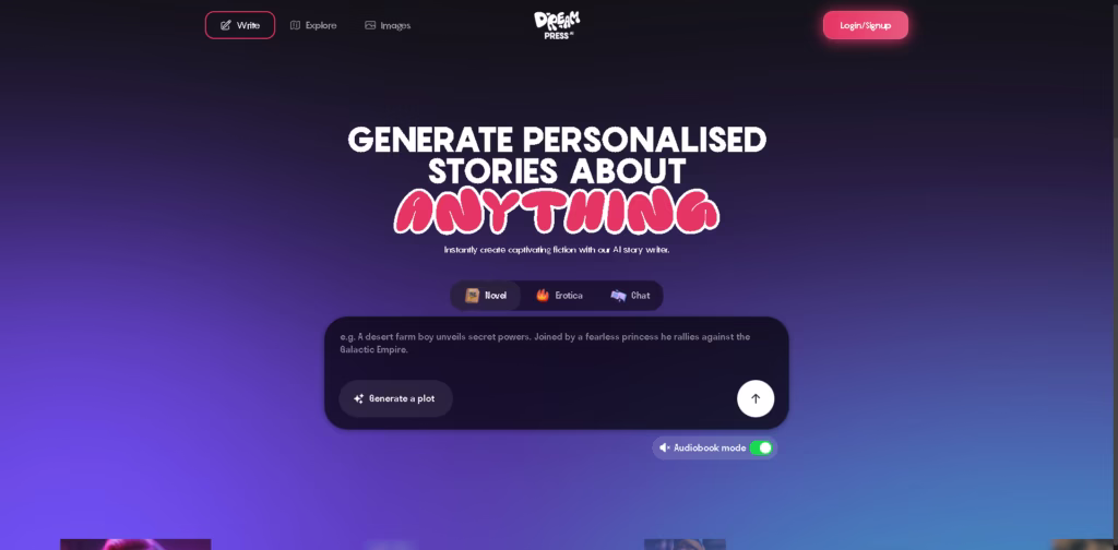 From novels and erotica to fantasy, sci-fi, and drama, DreamPress AI helps authors, hobbyists, and content creators craft captivating stories in minutes.
