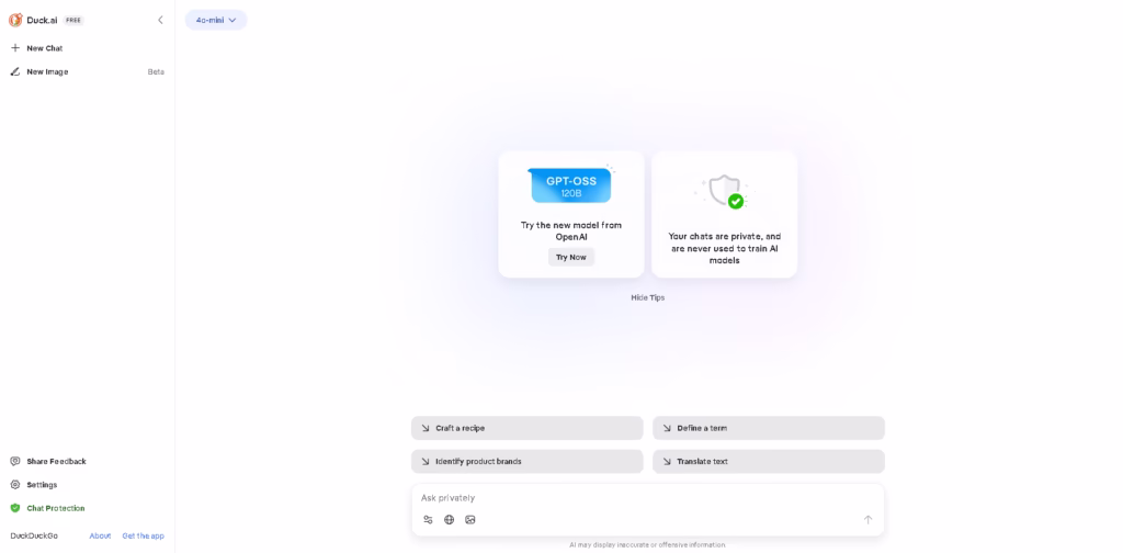 DuckDuckGo is a simple, free, and privacy-first AI tool that works across multiple needs-text, images, and translations.