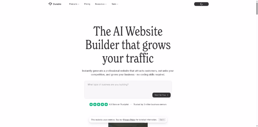 Whether you’re a freelancer, small business owner, or e-commerce entrepreneur, Durable is a powerful, all-in-one solution to get online and stay ahead. Start building your site today-no coding required!