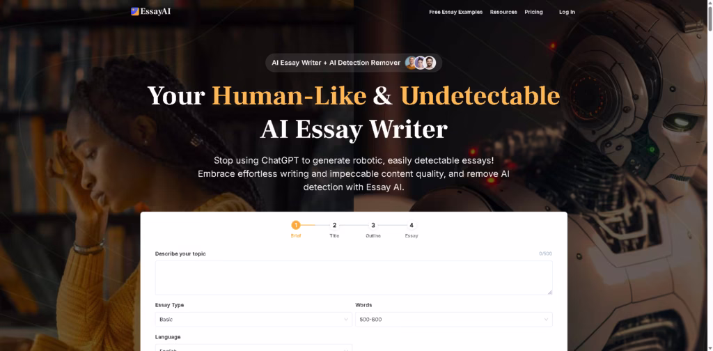 EssayAI positions itself as an “undetectable” AI essay writer with built-in detection tools and plagiarism safeguards. Its biggest selling point is the promise of bypassing AI detection systems while maintaining human-like quality.