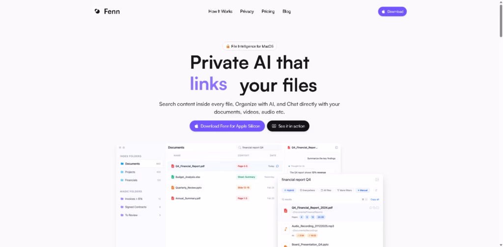 Fenn is a private AI for Mac that helps you search, organize, and interact with all your files, documents, images, audio, video, code, and more, without ever sending your data online.