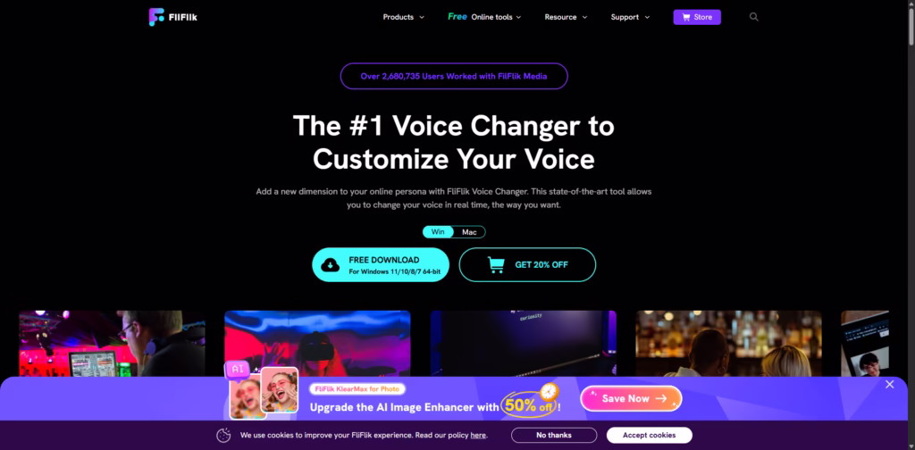 FliFlik Voice Changer is a real-time AI voice transformation tool that lets you change your voice across a huge variety of styles, record or import audio, and add sound effects.