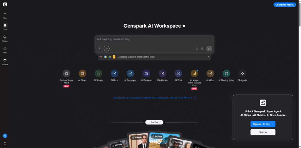 Genspark is an all-in-one AI workspace that doesn’t just generate ideas-it executes tasks. You set a goal, like creating a presentation, writing a report, or making calls, and its Super Agent handles everything for you.