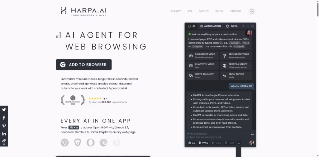 HARPA AI feels less like a chatbot and more like a true browser-side AI co-worker. It combines multiple top AI models, deep web awareness, and strong privacy into one seamless extension.