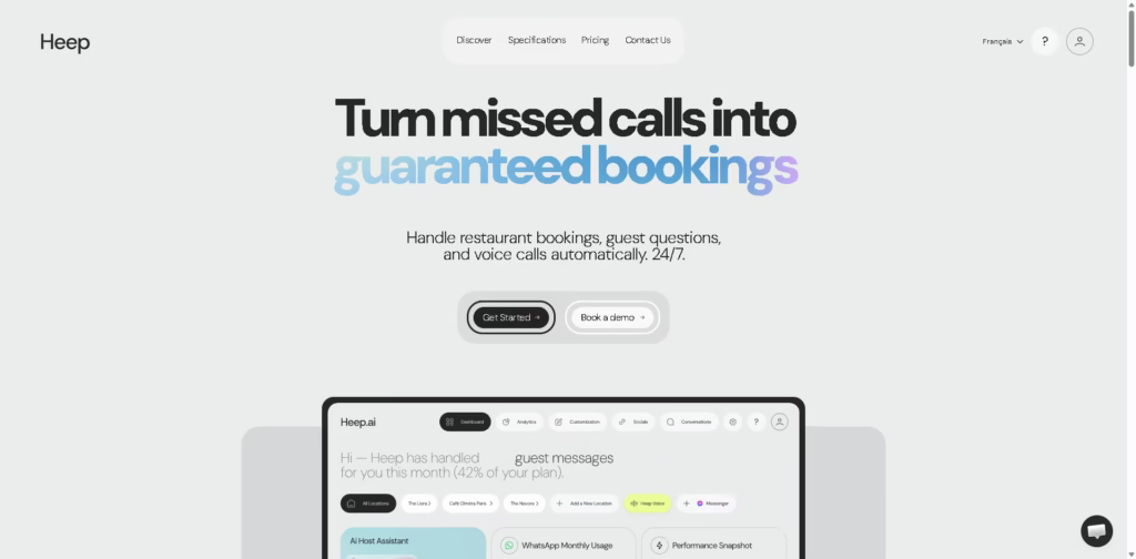 Heep is an AI-powered host assistant that automatically handles restaurant bookings, guest questions, and voice calls 24/7.