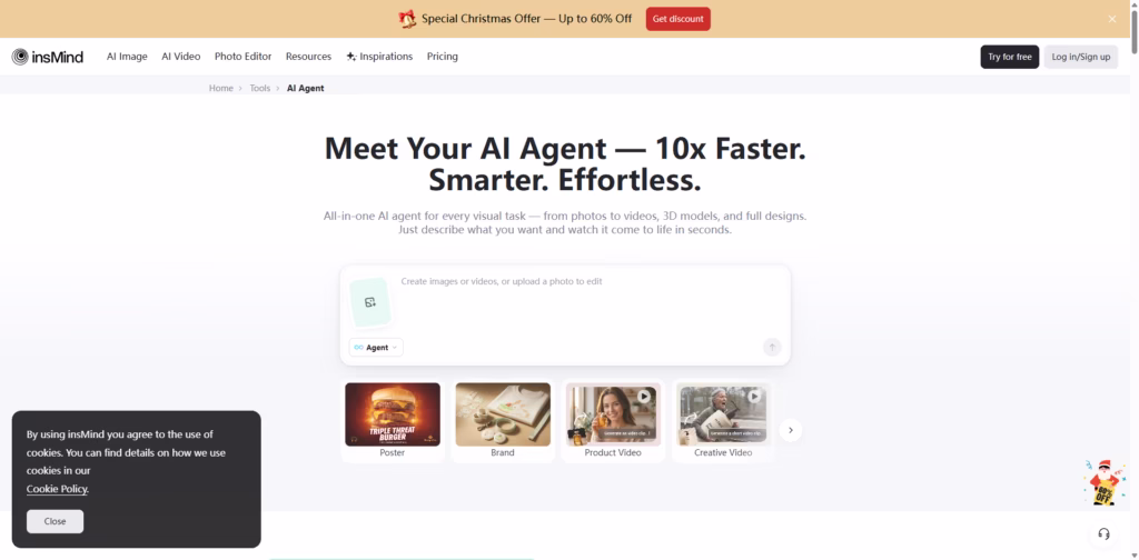 insMind AI Agent is a smart, all-in-one creative assistant that turns your ideas into images, videos, 3D models, and full brand visuals instantly.