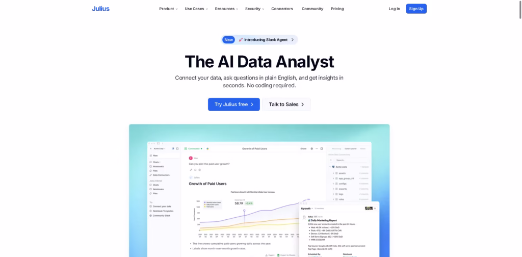 Julius is an AI-powered data analysis platform that allows users to connect multiple data sources and get actionable insights in seconds, no coding required.