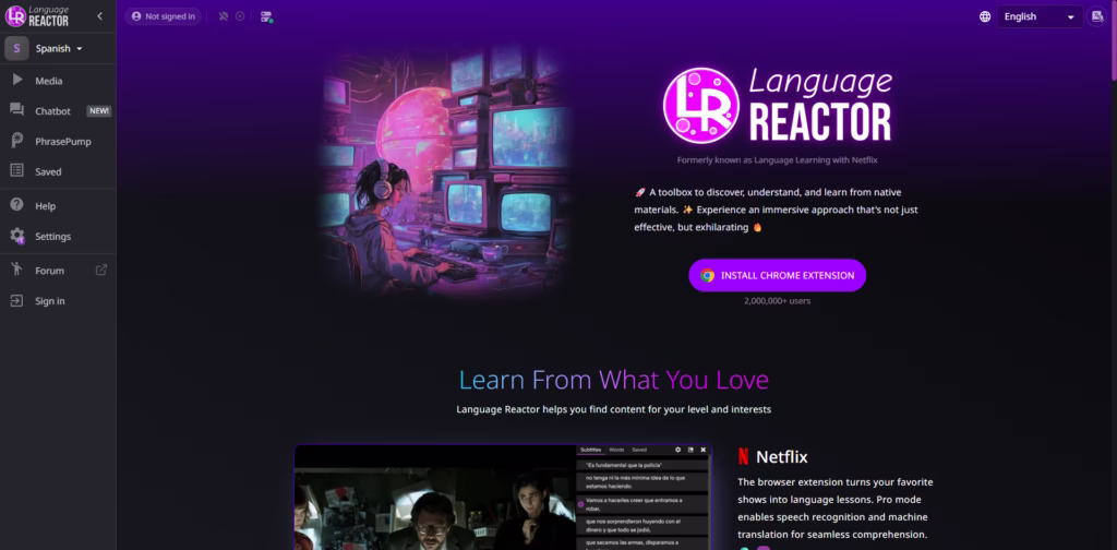 Language Reactor is a browser-based language learning tool that turns real-world content, like Netflix shows, YouTube videos, podcasts, books, and websites, into interactive language lessons.