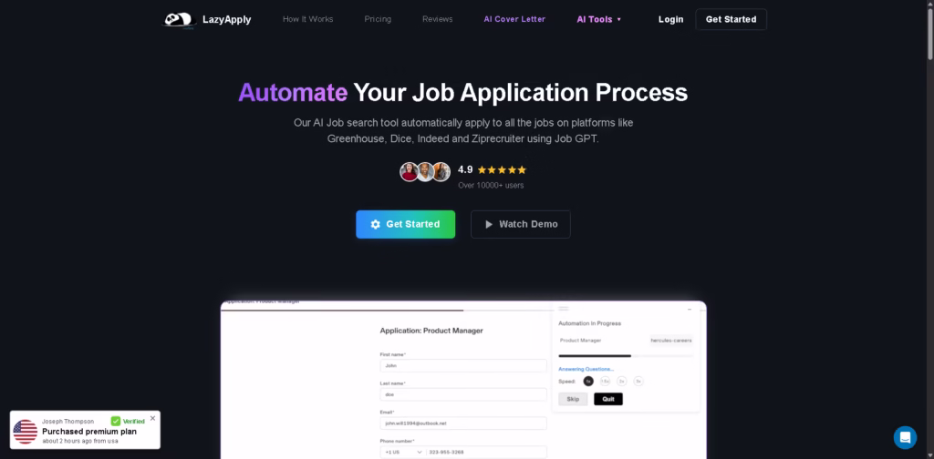 LazyApply is an AI-powered job application automation tool that applies to jobs on your behalf across major platforms like Indeed, ZipRecruiter, Greenhouse, and Dice.