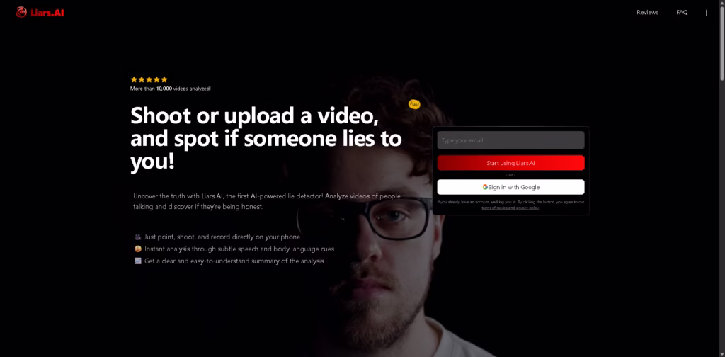 Liars.AI presents itself as a fast and accessible AI lie detector that analyzes speech and body language cues from videos.