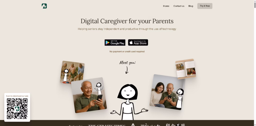 Through its AI assistant, Geni, it provides tech support, daily reminders, social engagement, and health monitoring. Families can stay informed via WhatsApp, while seniors receive guidance and companionship directly through the app.