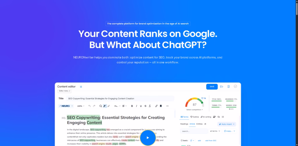 NEURONwriter is an all-in-one AI content platform designed to help businesses and creators dominate search engines and AI-driven search like ChatGPT.