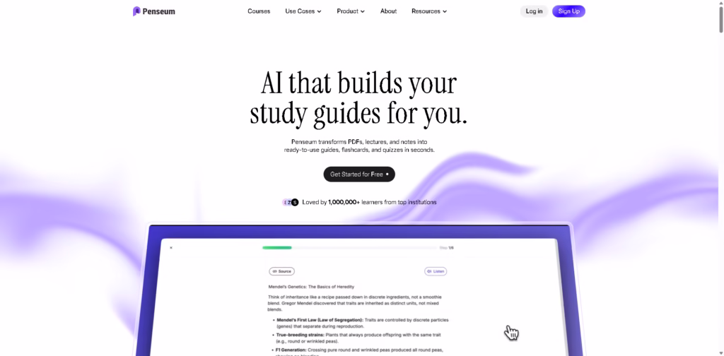 Penseum is an AI-powered study assistant that transforms your notes, PDFs, lectures, and slides into ready-to-use study guides, flashcards, quizzes, and bite-sized lessons.