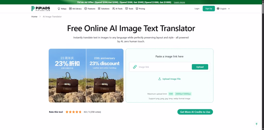 Pipiads AI Image Translator is a free, online AI tool that instantly translates text in images while preserving the original layout, style, and context.