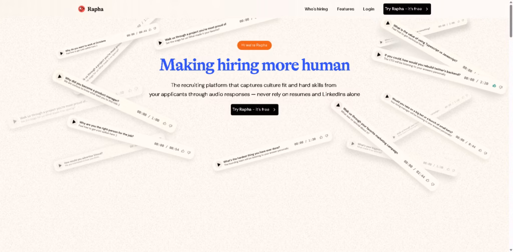 Rapha is an AI-powered recruiting platform that focuses on capturing candidates’ skills, culture fit, and personality through audio responses.