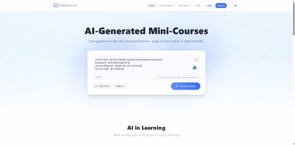 RapiLearn AI transforms questions or uploaded files into ready-to-use mini-courses. Whether you want to learn, teach, or review, it structures knowledge for you, turning PDFs, videos, or slides into digestible lessons almost instantly.