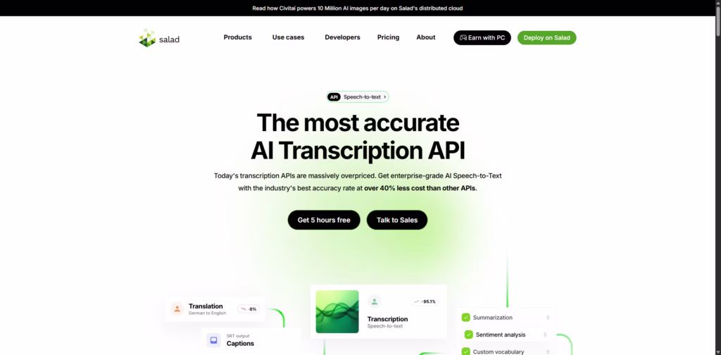SaladCloud is a powerful AI-driven cloud platform that powers large-scale applications like AI transcription, image generation, and other compute-heavy workloads.