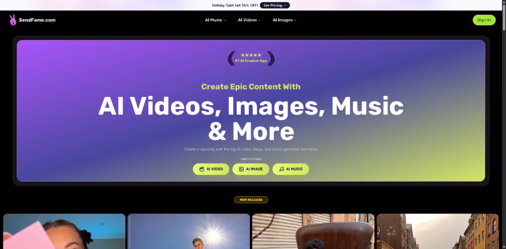 SendFame is an all-in-one AI creator platform that lets anyone generate videos, images, music, songs, and voice content in seconds.