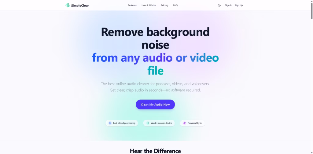 SimpleClean is an AI-powered online tool that instantly removes background noise from audio and video files.