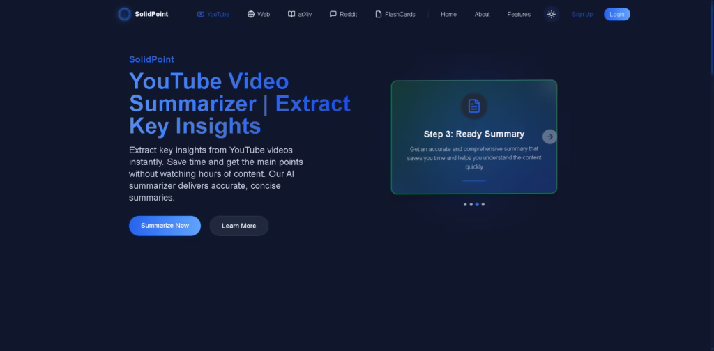 SolidPoint is an AI-powered summarization tool that turns long YouTube videos, web pages, Reddit threads, and research papers into concise, easy-to-digest summaries.