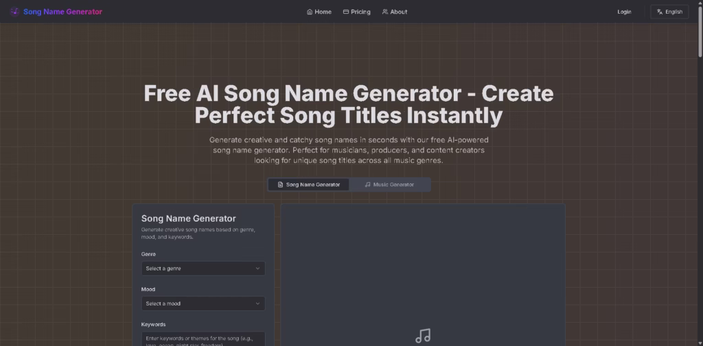 Song Name Generator is an AI-powered tool that helps musicians, producers, and content creators instantly generate catchy, unique, and memorable song titles.