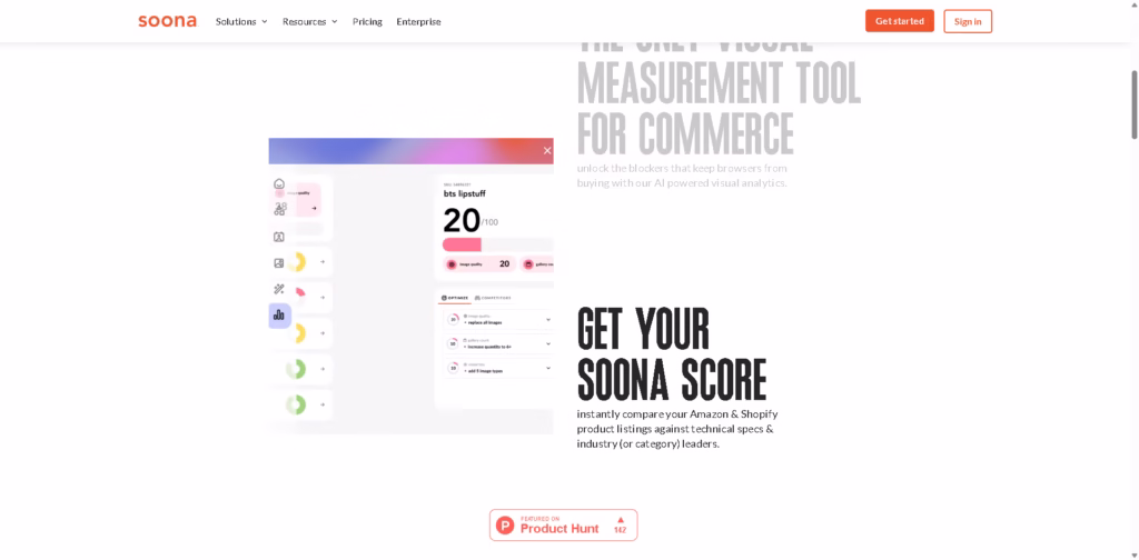- Soona Score: AI-powered visual analytics that measure product listings against specs and competitors.