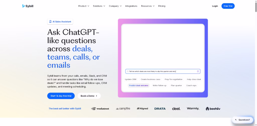 Sybill is an AI-powered sales assistant that goes beyond simple note-taking. It learns from your calls, emails, Slack, and CRM to automate follow-ups, update your CRM, prep for meetings, and even provide predictive insights on deals.