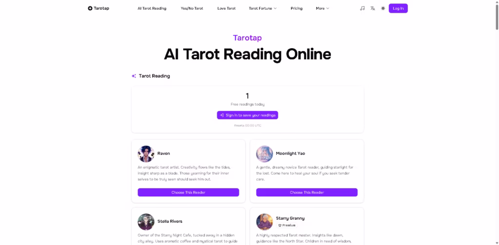 - Free Daily Readings: Limited free readings reset daily, with sign-in options to save sessions.