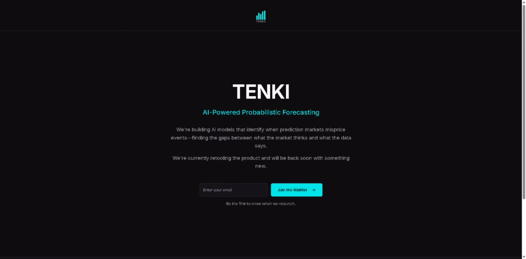 Tenki promises a smart way to spot inefficiencies in prediction markets using AI. While it’s currently in development, joining the waitlist ensures you’ll be among the first to explore its unique probabilistic forecasting tools once it relaunches.