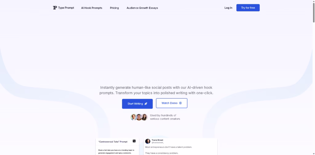 Type Prompt is an AI-powered content creation tool that helps you instantly generate human-like social media posts, LinkedIn updates, newsletters, blogs, X threads, and replies.
