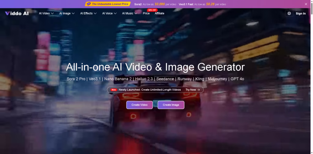 Viddo AI stands out for bringing video, image, and music generation into one clean, beginner-friendly platform. Instead of paying for separate tools, you get access to multiple leading AI models under one dashboard.