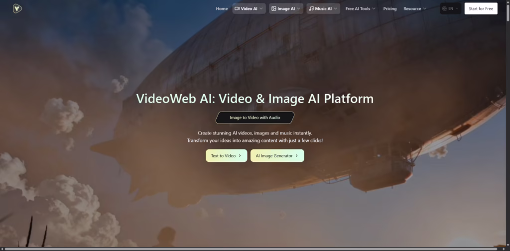 VideoWeb AI is an all-in-one creative platform that turns your ideas into stunning AI-powered videos, images, and music.