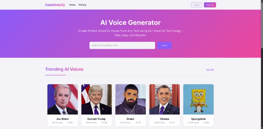 - Celebrity Voice Library: Access voices like Joe Biden, Donald Trump, Drake, Morgan Freeman, and more.