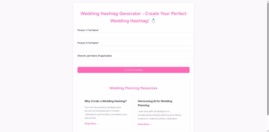 Wedding Hashtag Generator is a simple AI-powered tool that creates personalized wedding hashtags based on the couple’s names.