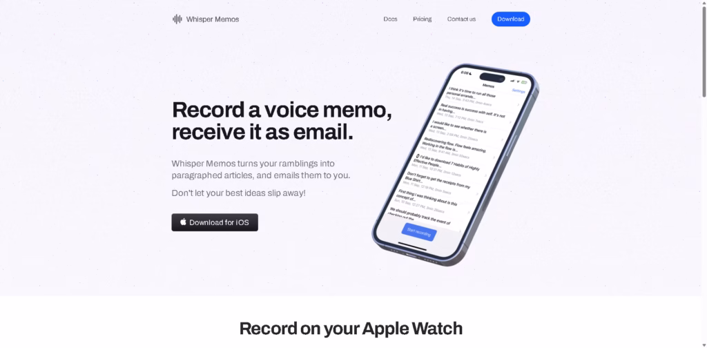 Whisper Memos is an AI-powered voice memo app that turns your spoken thoughts into neatly paragraphed articles and emails them to you.