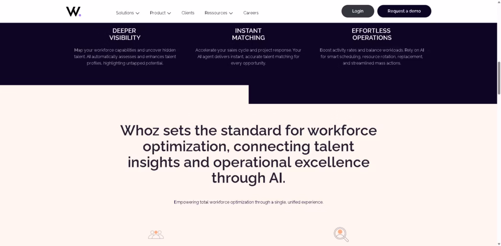 Whoz is an AI-powered workforce optimization platform that helps organizations map skills, match talent to projects, and optimize scheduling.